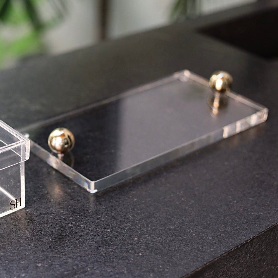 Minimalista, sofisticada e super versátil! A Bandeja Bubble Gold Pequena é feita em acrílico cristal com acabamento impecável e traz o detalhe de duas esferas metálicas douradas que funcionam como puxadores delicados.