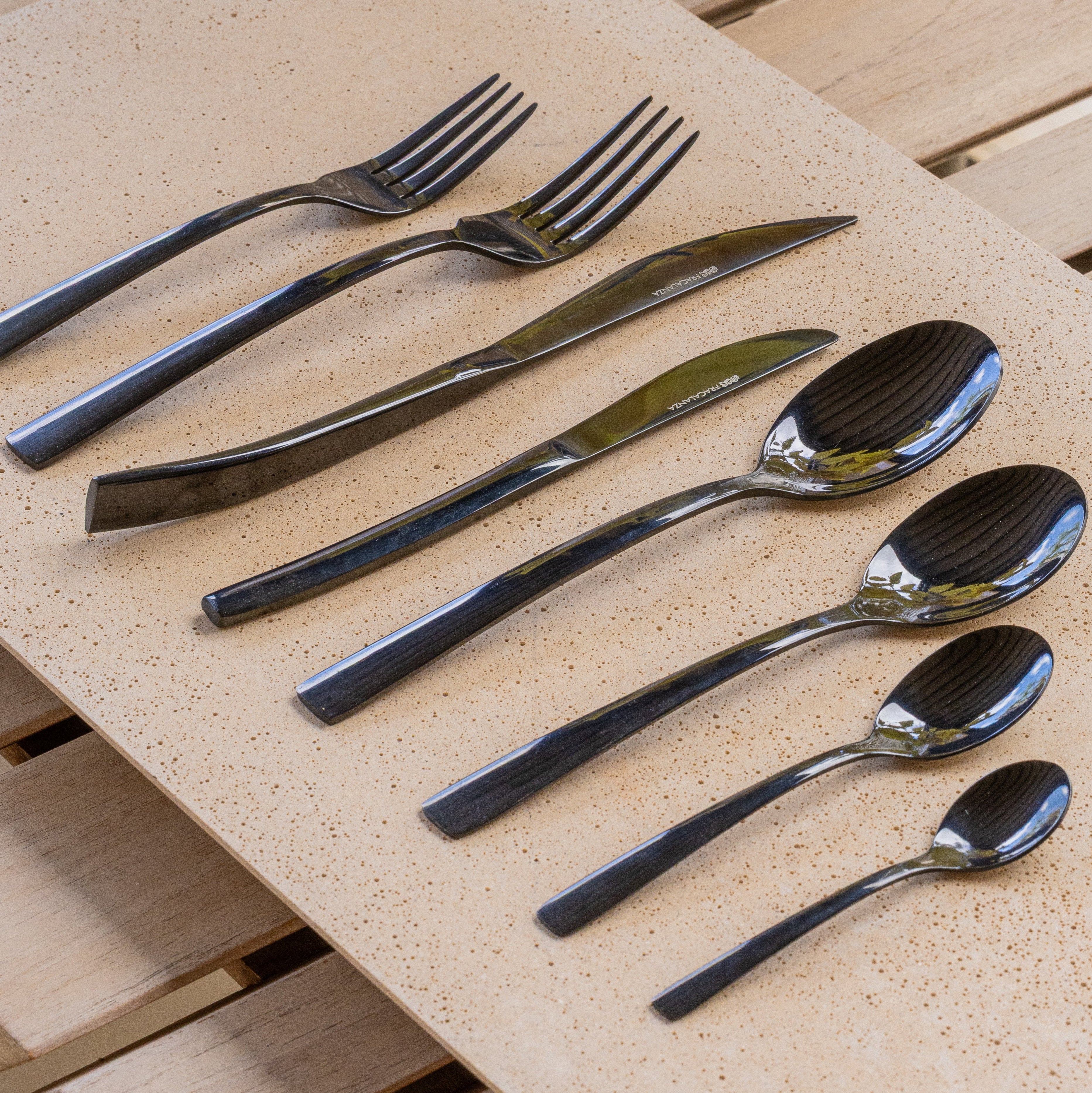 Detalhes sobre os talheres Fracalanza: Polimento entre os dentes dos garfos; Peças inteiriças, sem emendas; Serrilhas das facas forjadas; Polimento autobrilho; Peças de servir com tamanho ideal.