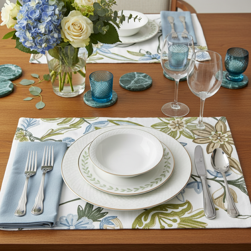 Elegante e cheio de charme artesanal, o Jogo Americano Jaipur é confeccionado em linho e traz um delicado bordado de flores nas cores azul, verde, bege e marrom. Cada detalhe revela o cuidado e a sofisticação da peça — perfeita para compor uma mesa posta acolhedora, com toque natural e refinado.