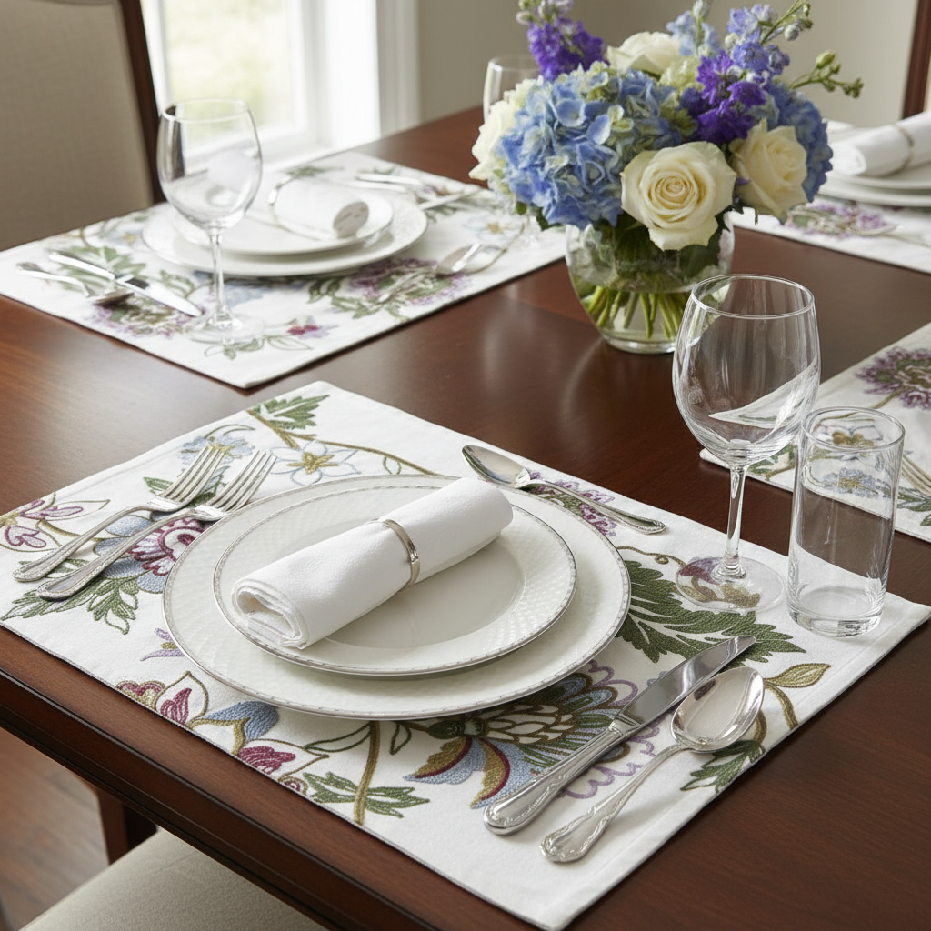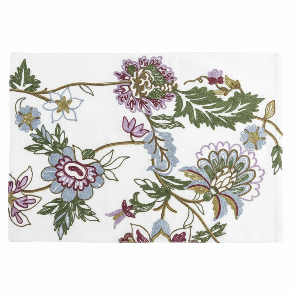 O Jogo Americano Jaipur traz a delicadeza do linho combinada ao encanto do bordado floral em tons de lilás, azul, verde e bege. Cada ponto traduz elegância e leveza, criando uma composição sofisticada e serena para a mesa posta.