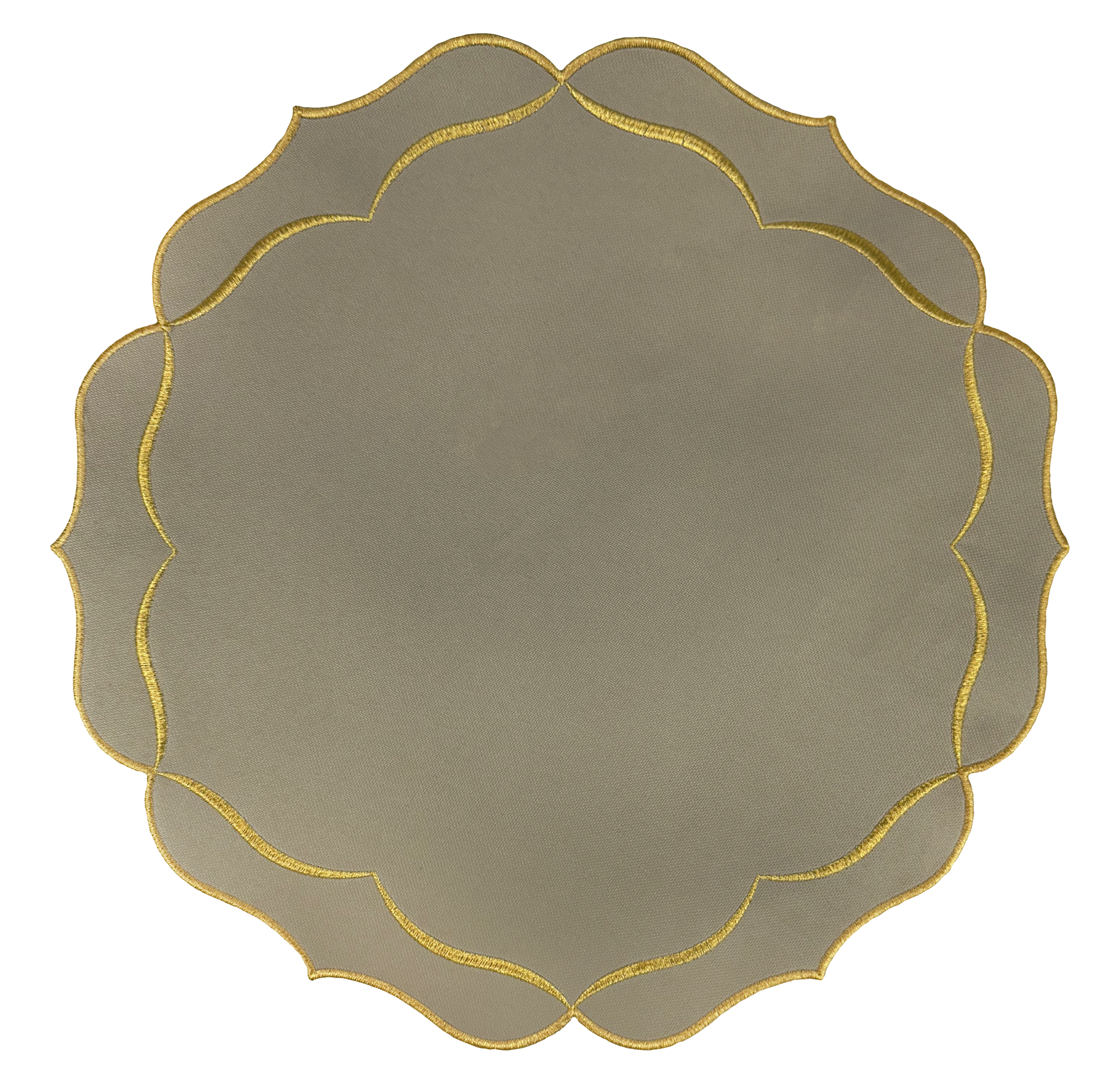 Sofisticado e marcante, o jogo americano redondo em tecido semi-impermeável fe di traz bordado em lurex dourado em toda a borda, formando um contorno elegante que valoriza qualquer composição.