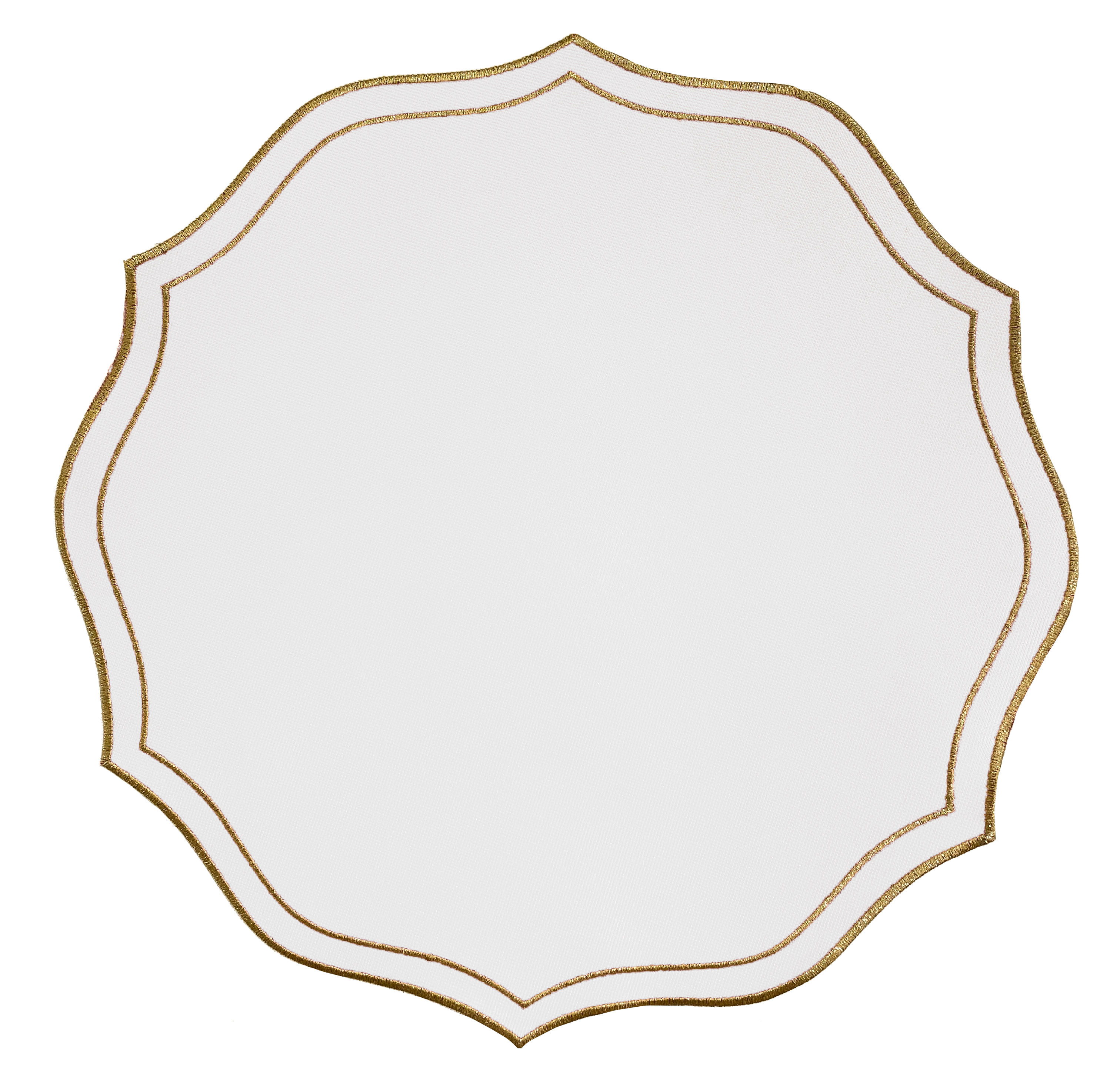 Jogo americano redondo, em tecido semi-impermeável branco, com bordado dourado em toda sua volta.