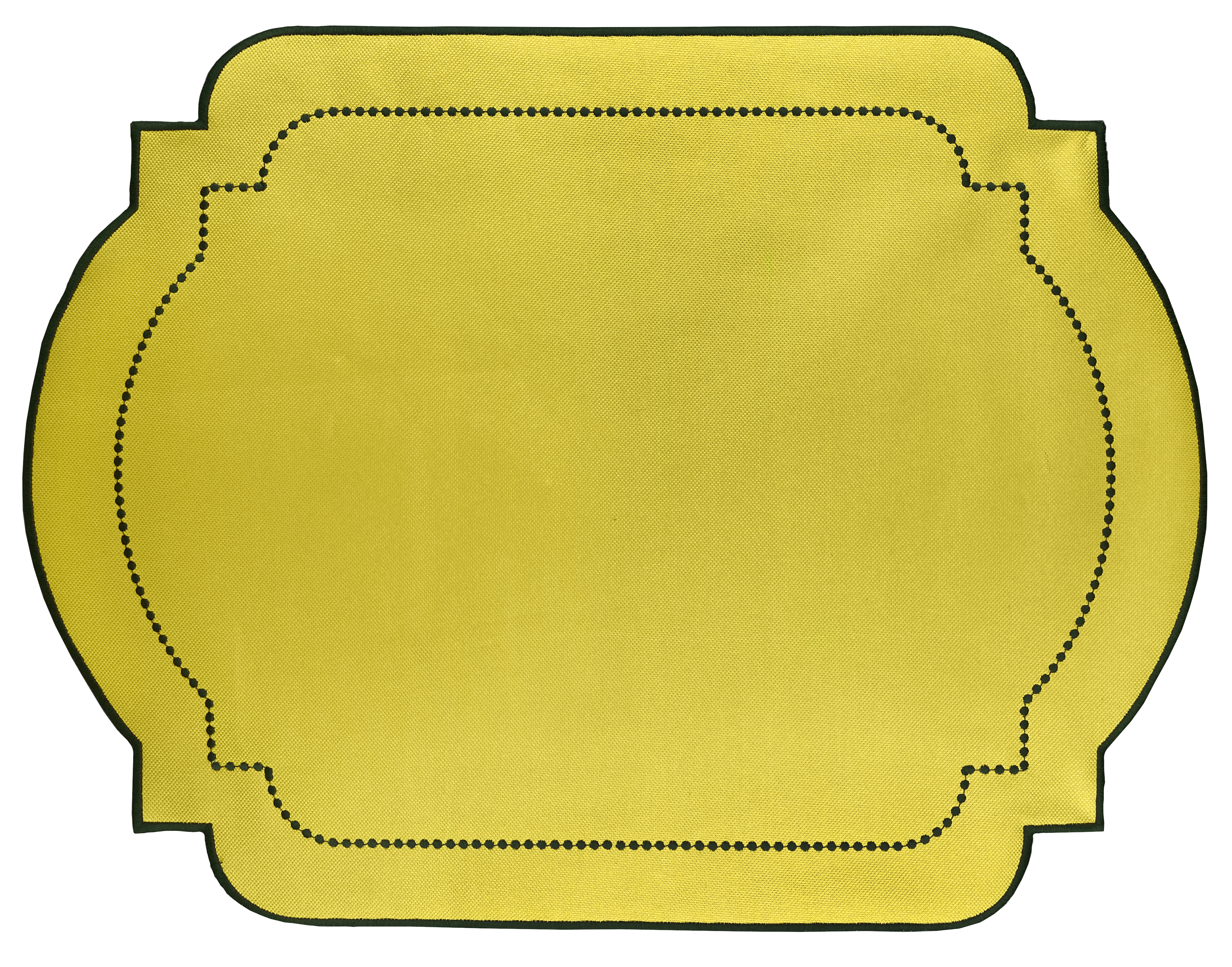 Jogo americano retangular, em nylon amarelo, com bordado verde em toda sua volta.