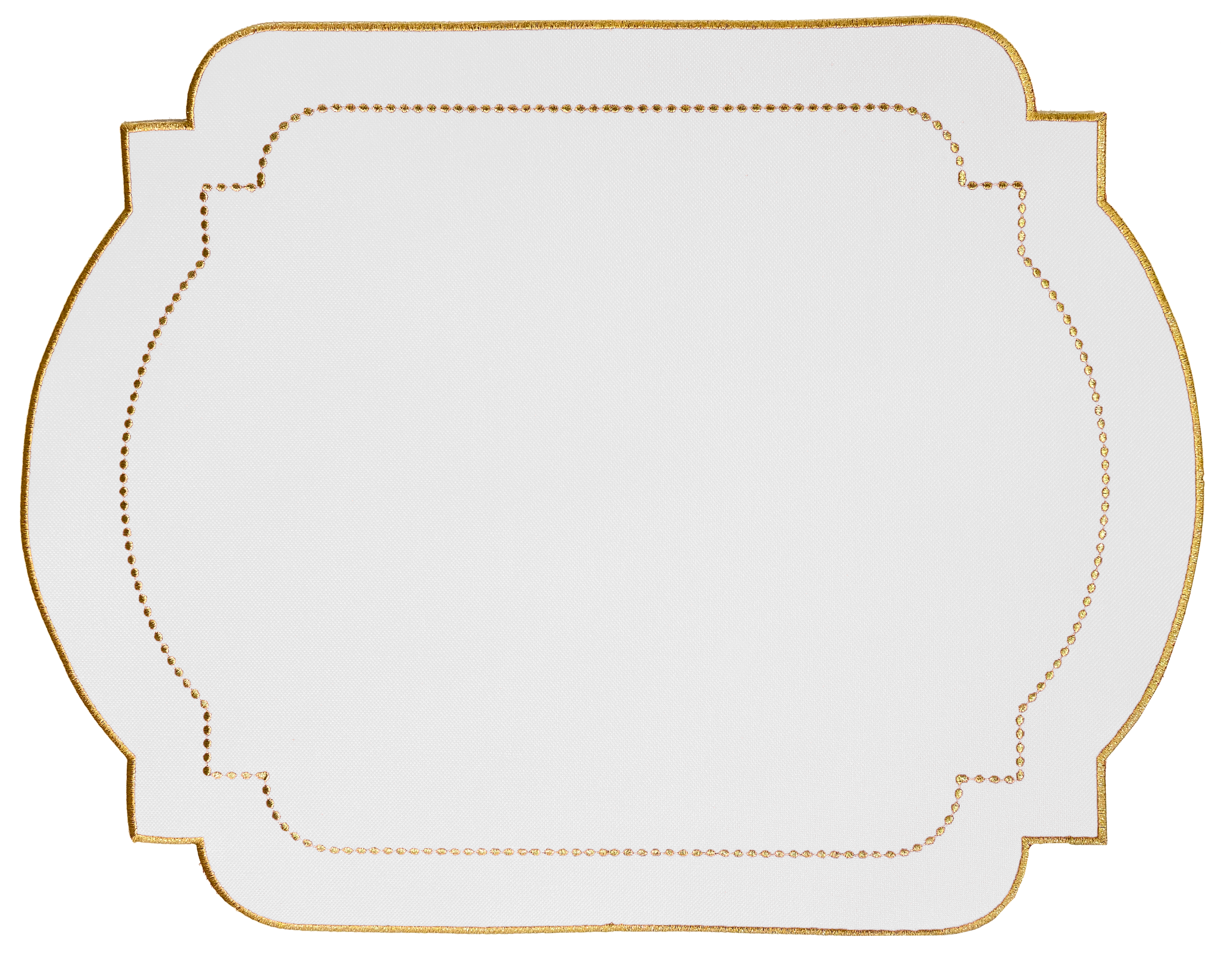 Jogo americano retangular, em nylon branco, com bordado dourado em toda sua volta.