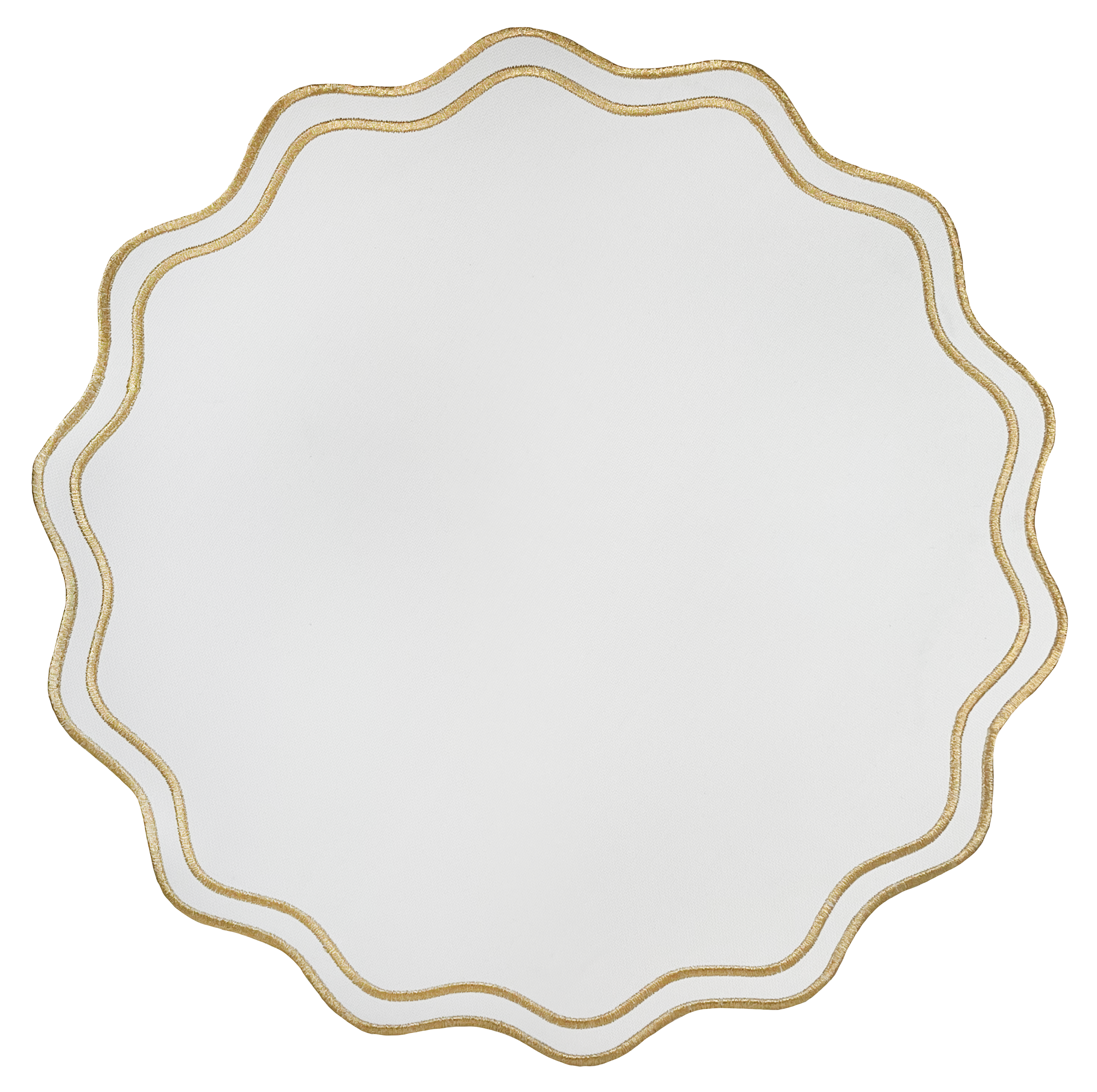 Elegante e atemporal, o jogo americano redondo em tecido semi-impermeável branco traz bordado dourado em toda a borda, criando um contorno delicado e sofisticado.
