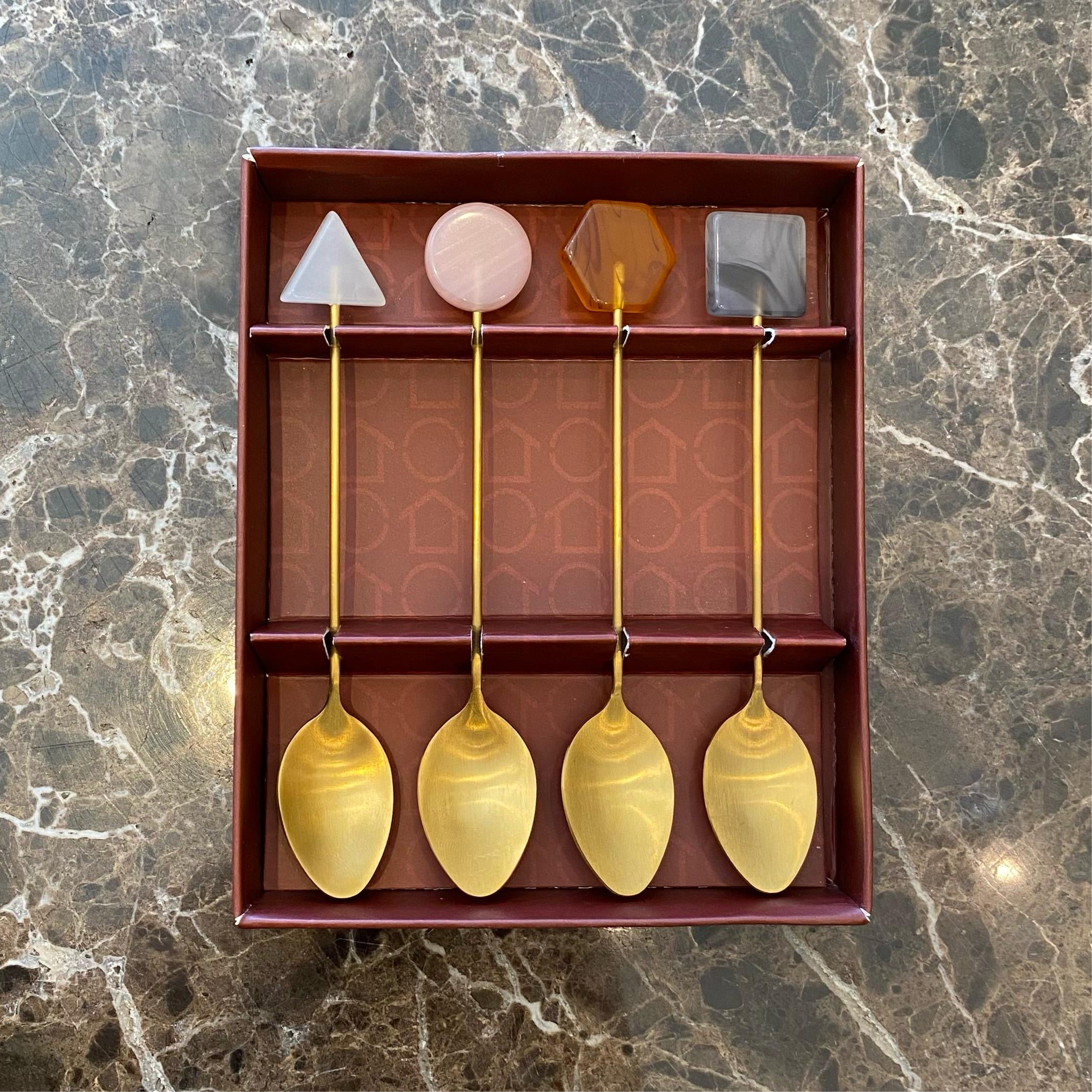 Um toque de arte para o seu café ou chá. Este conjunto exclusivo traz 4 colheres em aço inox com acabamento em ouro escovado tamanho ideal para acompanhar suas xícaras, cada uma com um detalhe geométrico em pedra natural: quartzo rosa, ágata, ônix e outras variações em formas únicas como triângulo, círculo, losango e quadrado.