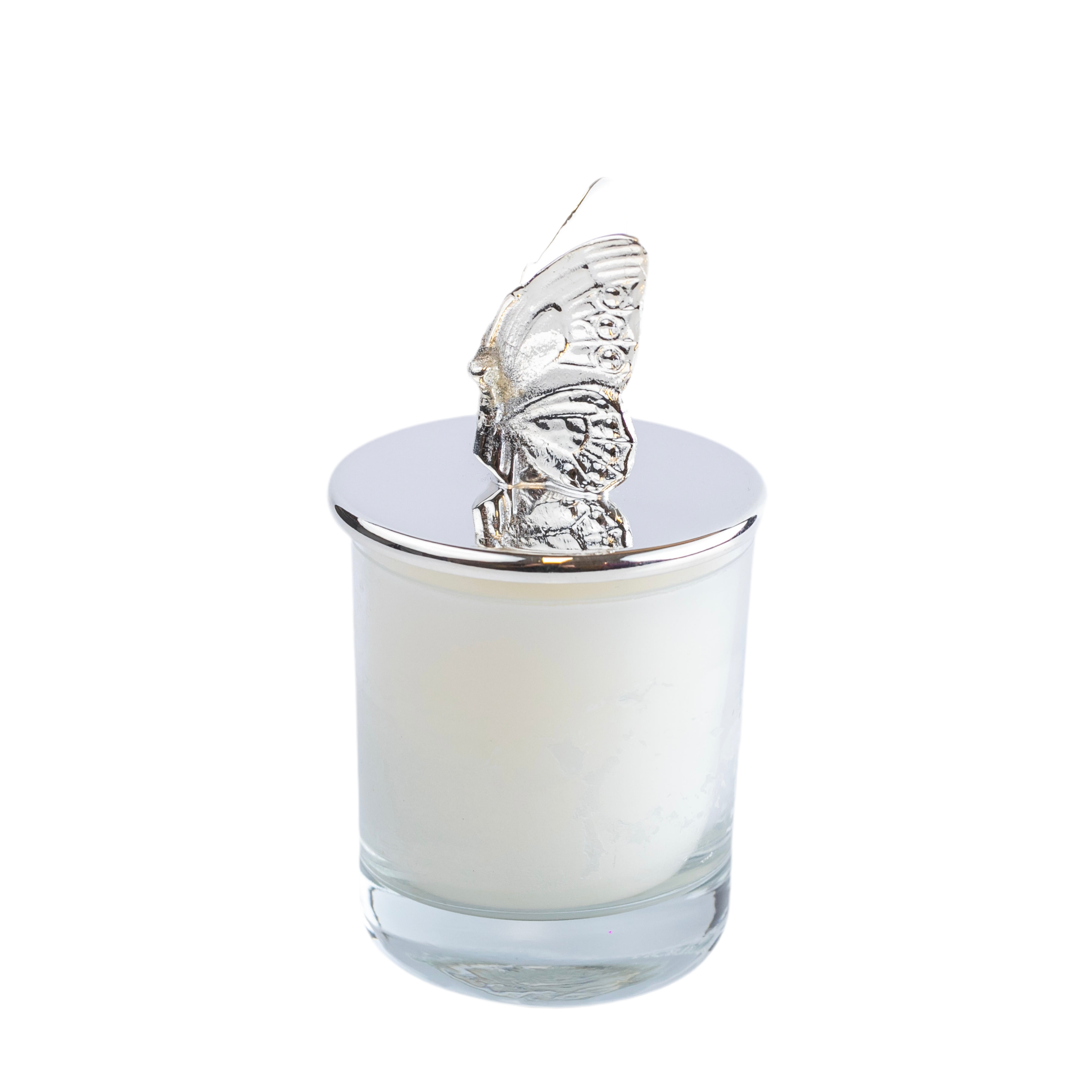 Porta vela com borboleta trabalhada em prata da MarcaShefield Plate.