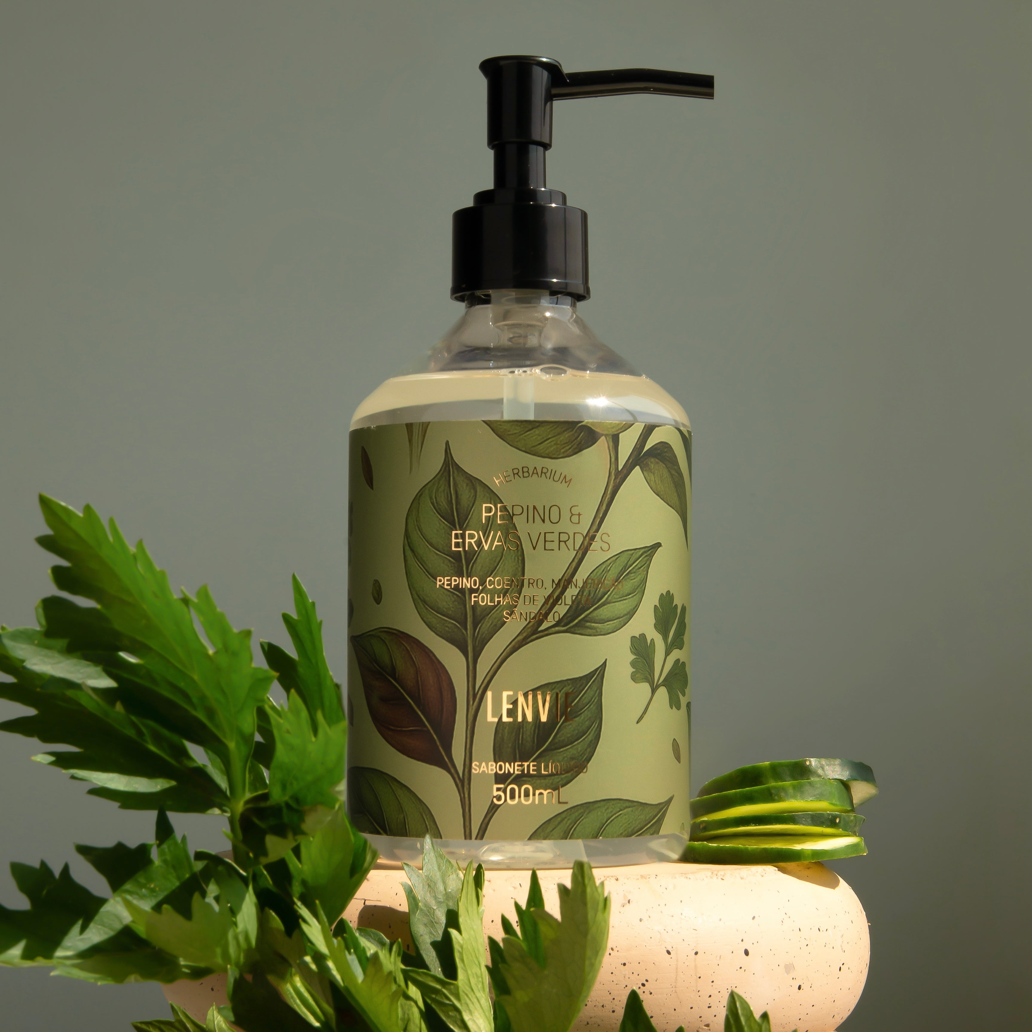 Apresentamos a Herbarium, a nova linha de cozinha da *LENVIE*, com fragrância exclusiva de Pepino & Ervas Verdes.