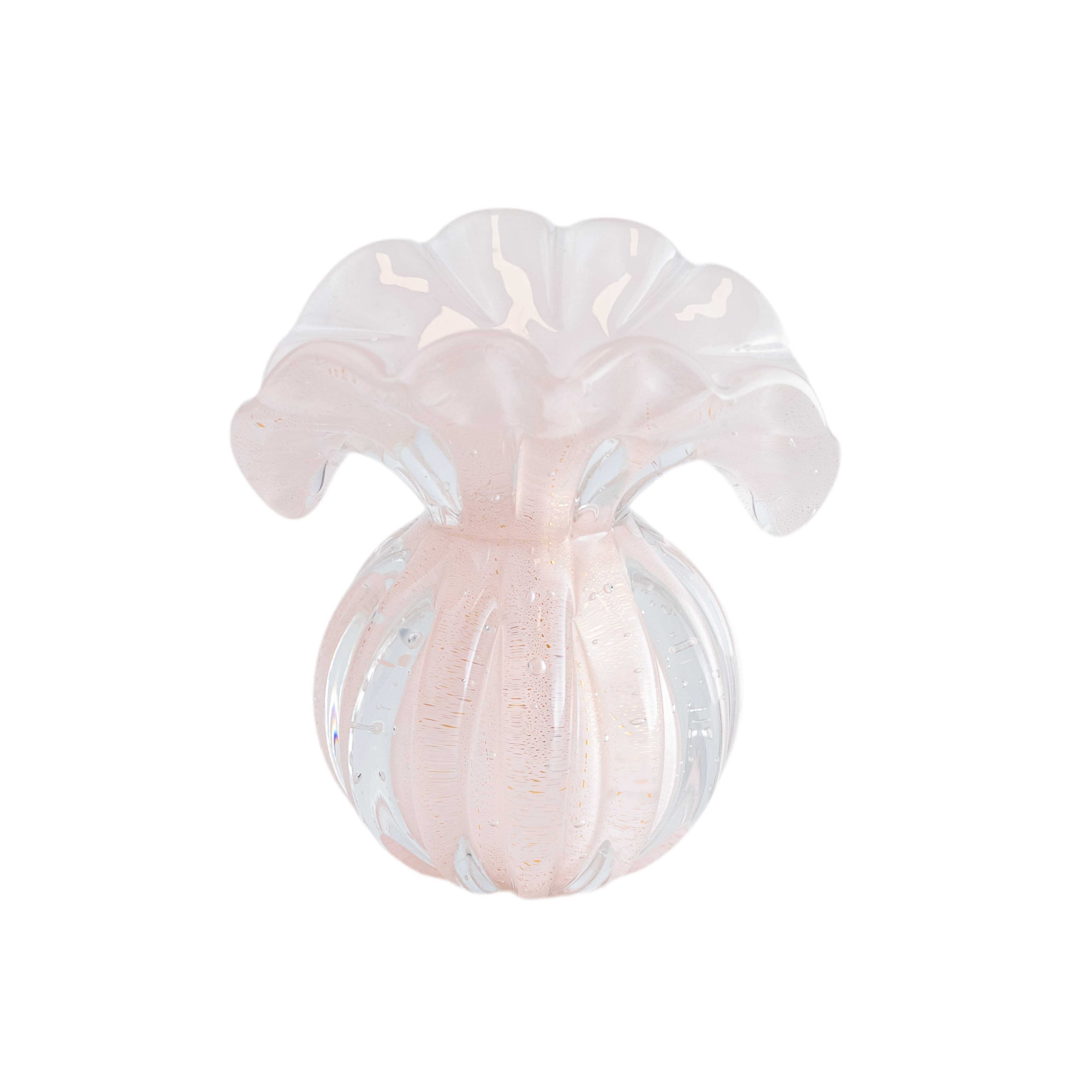 O tom rosa jade transmite suavidade, enquanto o acabamento com pó de ouro aplicado manualmente adiciona brilho sutil e um toque de luxo. Feita à mão em vidro murano, cada peça é única e carrega a tradição do artesanato artístico.